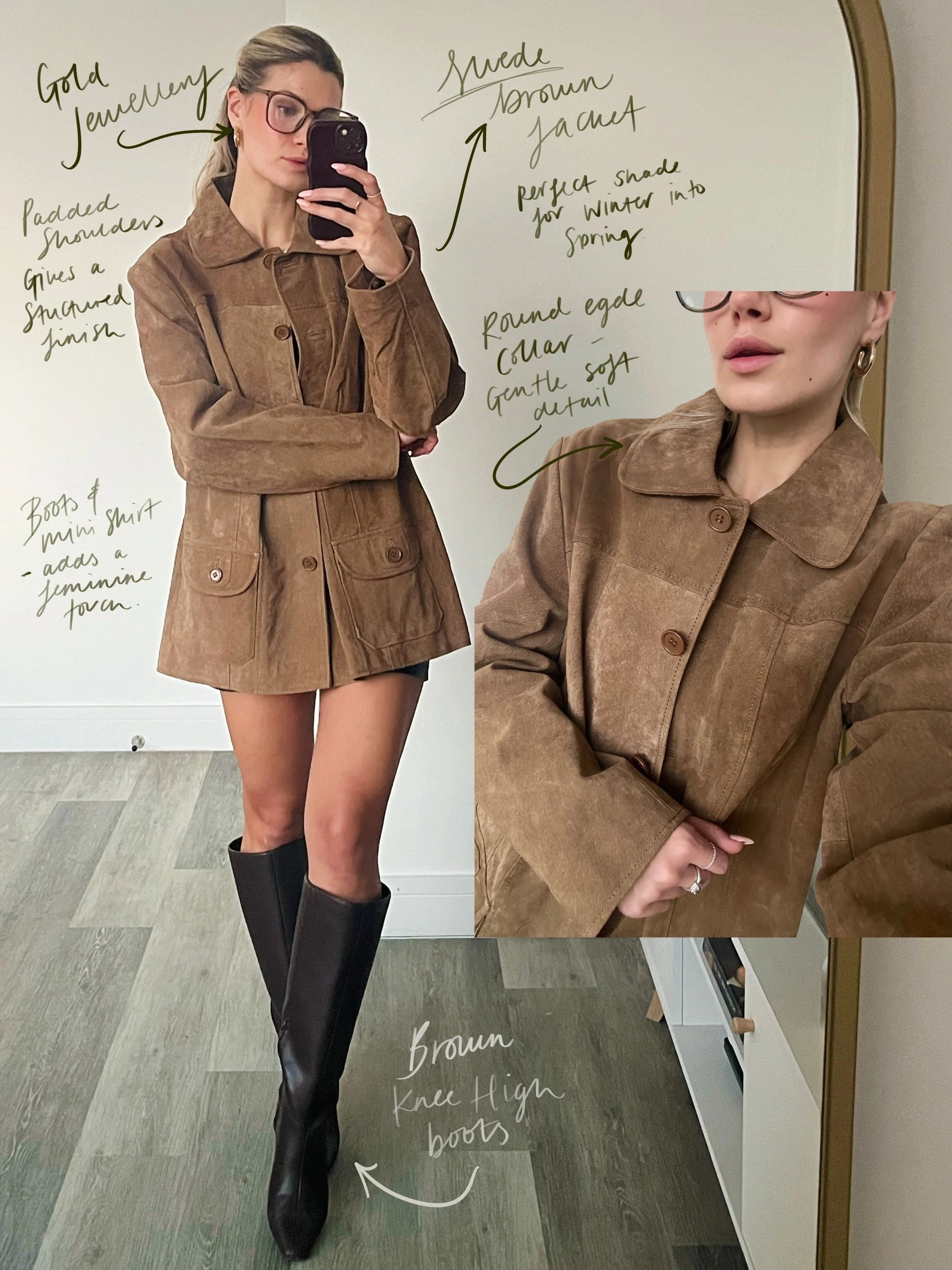 So why does it still work in spring? For me, it’s all about balance. While suede naturally feels luxurious and substantial, other shades of brown and tan soften its look, making it perfect for those transitional months. I love throwing mine over a white tee, mini skirt and boots or pairing it with linen trousers on a cooler spring evening. It brings just enough structure to an outfit without feeling too heavy or out of place.